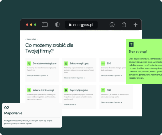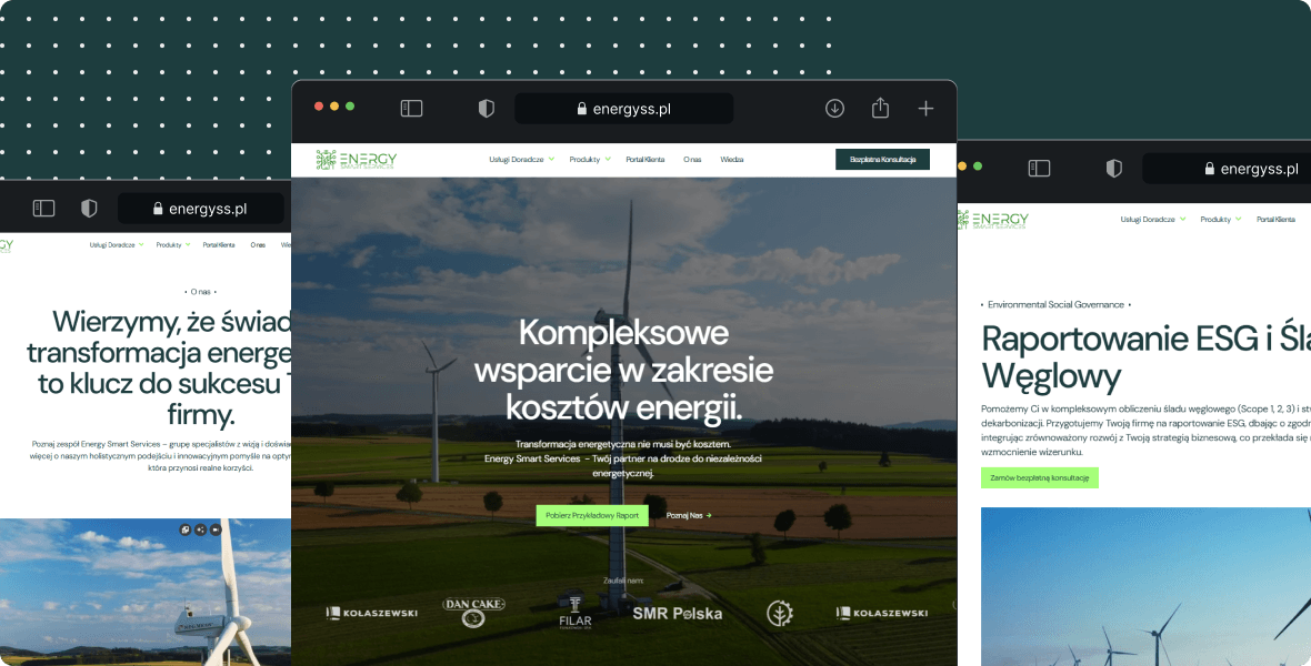 W efekcie firma coraz częściej musiała odpowiadać na te same pytania telefonicznie zamiast pozwolić stronie zrobić to za nią.W branży, gdzie zaufanie i szybkość decyzji są kluczowe, taka sytuacja po prostu nie mogła trwać. Dlatego, gdy Energyss zaczęło rozwijać ofertę i potrzebowało nowego narzędzia do komunikacji z rynkiem, kierunek był jasny: prosta, przejrzysta strona, która nie wymaga tłumaczenia i działa bez zbędnych komplikacji. Przy rozsądnym budżecie najważniejsze było znalezienie rozwiązania, które da realny efekt bez nadmiaru formy i rozbudowanych procesów.