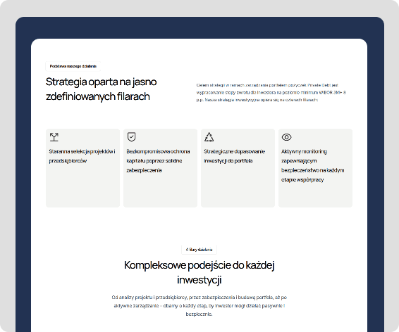 Połączyliśmy dwa światy – inwestorów i pożyczkobiorców – w jednej, dobrze zorganizowanej przestrzeni. Zamiast prowadzić użytkownika na osobne strony, stworzyliśmy logiczną strukturę, która rozpoznaje jego potrzeby i prowadzi dokładnie tam, gdzie powinien trafić.